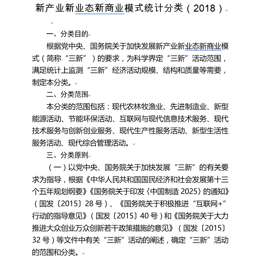 近日,為科學(xué)界定新產(chǎn)業(yè)新業(yè)態(tài)新商業(yè)模式(以下簡稱“三新”)范圍,滿足統(tǒng)計(jì)上監(jiān)測“三新”經(jīng)濟(jì)活動(dòng)規(guī)模、結(jié)構(gòu)和質(zhì)量等需要,國家統(tǒng)計(jì)局以黨中央、國務(wù)院關(guān)于加快發(fā)展“三新”的有關(guān)要求為指導(dǎo),以《國民經(jīng)濟(jì)行業(yè)分類》(GB/T 4754-2017)為基礎(chǔ),制定了《新產(chǎn)業(yè)新業(yè)態(tài)新商業(yè)模式統(tǒng)計(jì)分類(2018)》。