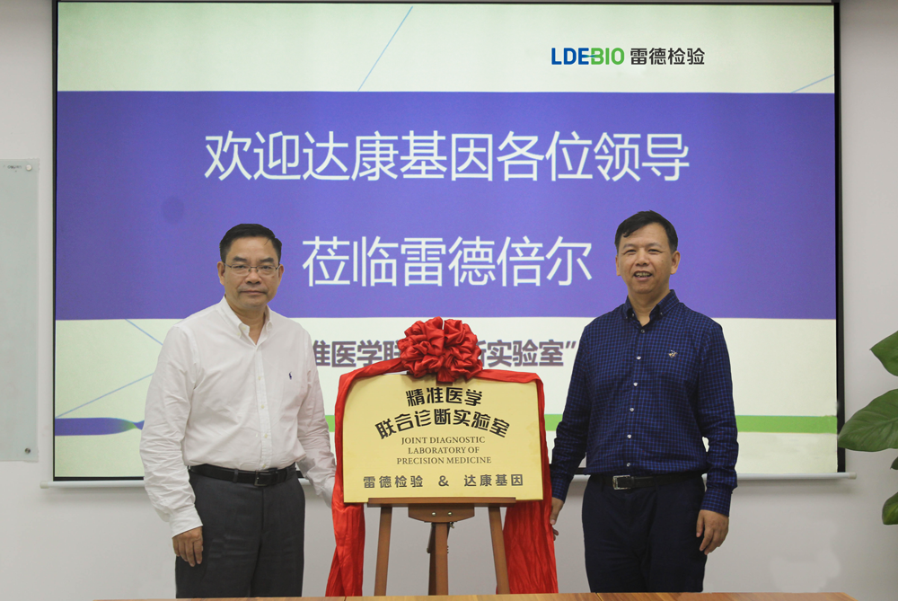 2019年4月10日,廣州市雷德醫(yī)學檢驗實驗室有限公司(以下簡稱“雷德檢驗”)與廣州達康基因技術有限公司(以下簡稱“達康基因”)共同組建的 “精準醫(yī)學聯(lián)合診斷實驗室”在雷德檢驗掛牌成立。雷德檢驗董事長、總經(jīng)理、首席科學家樓建榮博士,達康基因創(chuàng)始人、董事長、大型三甲醫(yī)院血液腫瘤&生物治療首席專家肖揚教授等領導共同出席了本次揭牌儀式。